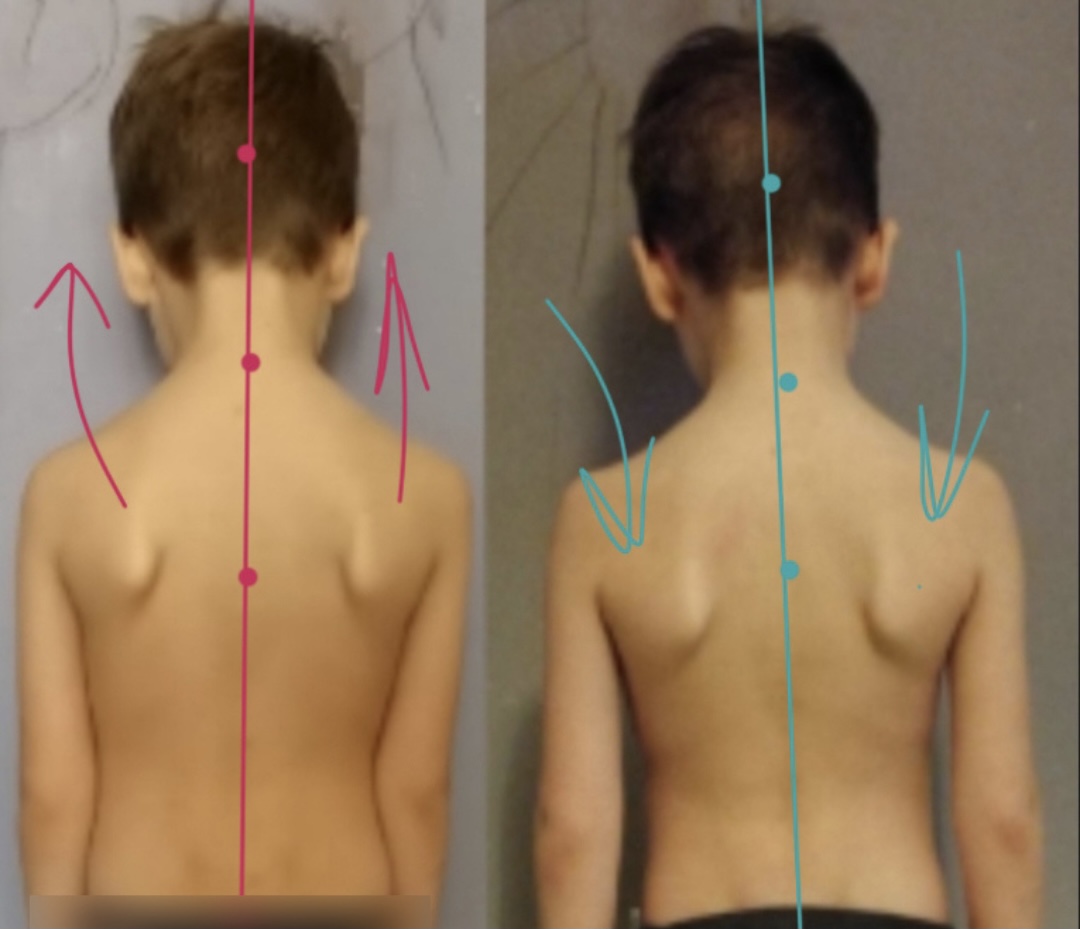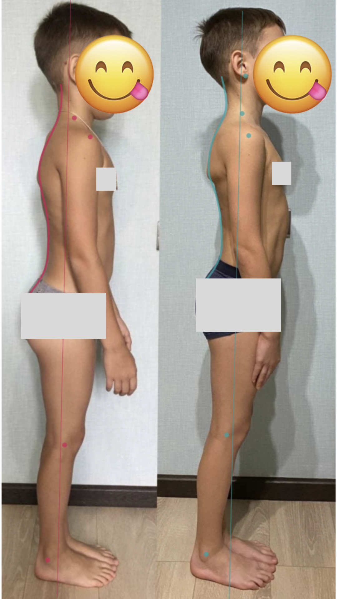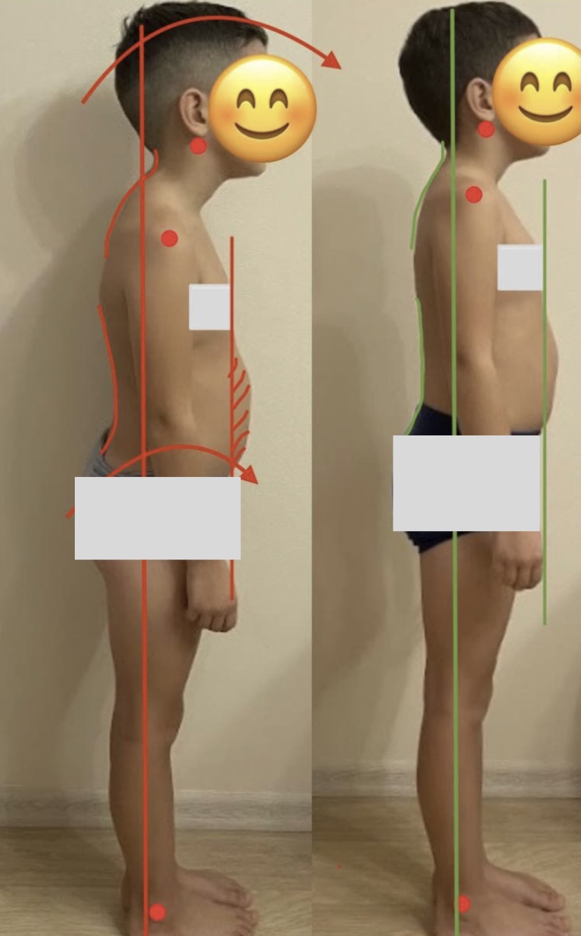 Конечно, прошло еще мало времени и полученный результат не окончательный, а промежуточный. Но вы можете увидеть, как здорово изменился баланс тела мальчика благодаря тренировкам!