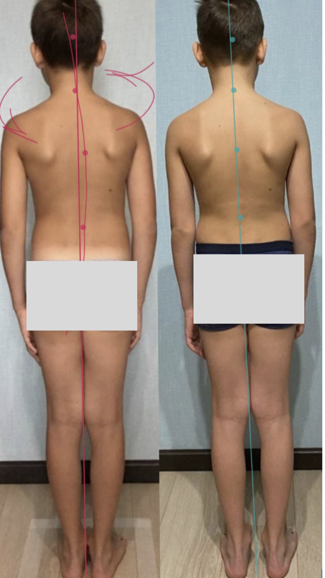 Опустился таз, передний наклон стал уменьшаться. Опустились плечи, расправились лопатки и грудной отдел. Шейный лордоз стал меньше. Сколиотическая дуга еще остается, но тем не менее тело стало ровнее, асимметрия лопаток менее выражена. Скручивание таза вправо стало уменьшаться, развернулись колени, складки на теле и бока стали более симметричными.
